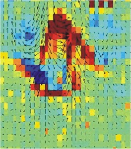 Below is a more detailed image showing velocity vectors on top of the acoustic backscatter, for the breaking wave shown above. The vectors show the deviations from the 10-minute average velocity at each height above the riverbed. Similarly, the colors show the deviations from the 10-minute average acoustic backscatter at each height. By showing the deviations from average conditions, the wave and its velocities are more clearly visible. The longest vector corresponds to a 5 cm/s deviation velocity, and the vectors are stretched by a factor of five in the vertical dimension to more clearly show the vertical component of velocity.