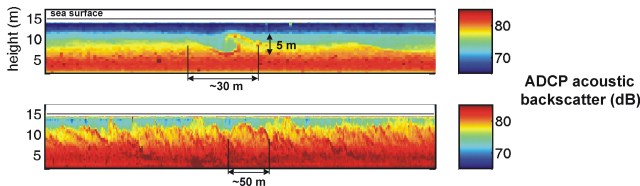 The first period (top panel) was before the period of peak tidal currents, ebbing toward the ocean, and the second period (bottom) was at the time of peak ebb currents, about half an hour later. Mean water velocities were ~1.4 m/s near the Hudson’s water surface (about 3 miles per hour), and near zero in the lower half of the water column. The vertical difference in water velocity, called shear, is likely the reason for the wave breaking into turbulence, and for the conversion to a completely turbulent state shown in the lower panel.