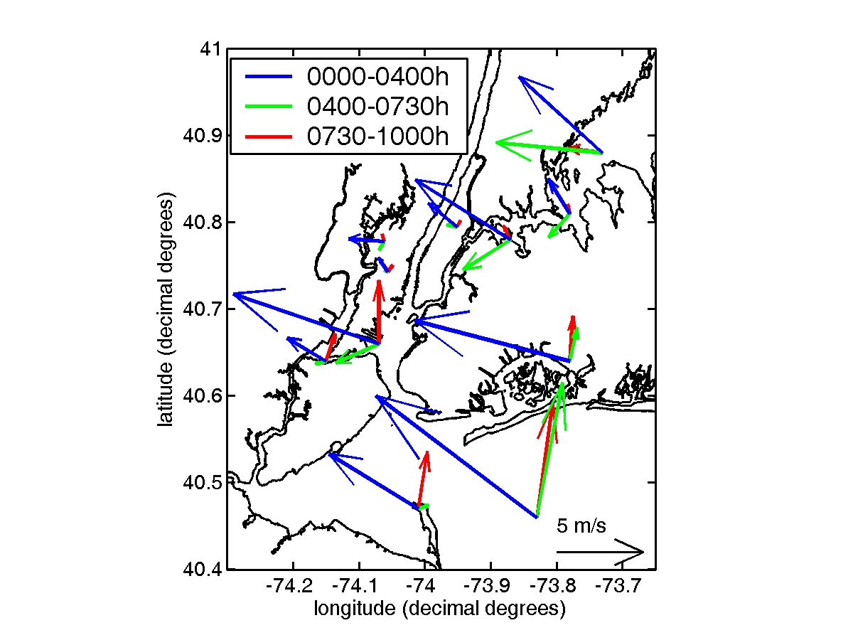 Wind vectors (arrows) above show the direction and speed (arrow length) of winds for three different time periods at several sites on the morning of January 8th, with the wind vector key at the bottom right (5 m/s is roughly equal to 10 mph). The winds follow a clear pattern where winds blew from Brooklyn (including Jamaica Bay) toward Manhattan between 00:00 and 04:00 hours the night before the big stink. Then, the winds from 4:00-7:30 AM is that the vectors (green) show a shifting wind pattern suggesting a passing warm front, with northeast winds in the top left and center of the map, and south winds to the lower right.