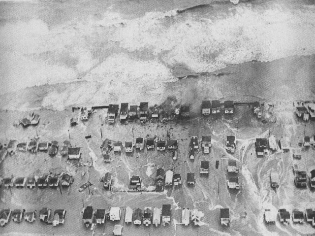 This figure below from their paper shows the water levels for several of the worst storms in recent centuries, measured at the southern tip of Manhattan – the storms at or above the second dashed line were also observed as sand layers in the sediment cores behind Long Beach. The average height of the modern (2002) barrier island crest (2.5-3.0 meters) is shown with the two dashed lines. Note that these are water levels in the Harbor – water levels at the beaches are higher due to (a) periodic wave run-up and (b) piling up of average water levels due to wave breaking – called wave set-up.