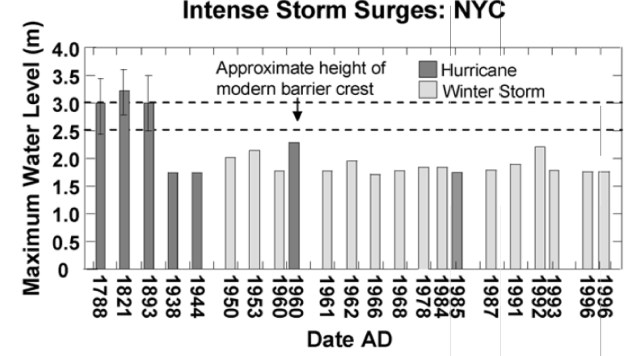 On the other hand, their results suggest that there were very long periods with no flood layers, so probably no hurricane strikes. The periods in the records that are thought to have had warmer tropical ocean temperatures actually had fewer hurricane strikes near NYC. Due to global warming, we are likely to have warmer ocean temperatures, so this may reflect the surprising result that global warming might reduce the number of hurricanes striking NYC’s plentiful shorelines.