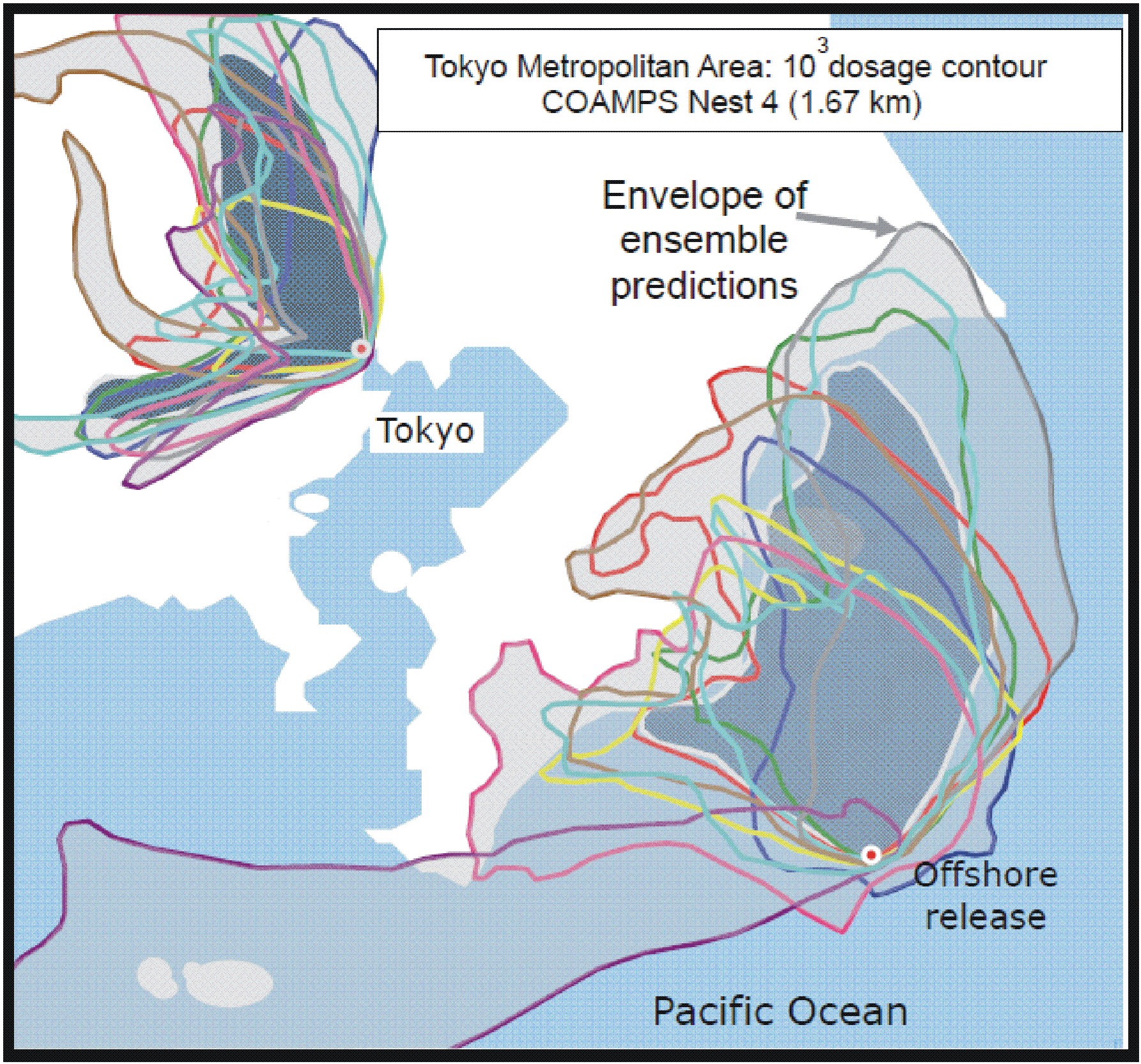 Model simulated accumulated 12-hour dosage for two arbitrary tracer releases in Tokyo and offshore of Tokyo. The different shaded contours represent different realizations in the model ensemble. The bi-pronged distribution for Tokyo is due to the timing of the release relative to the sea breeze. (Westward is before sea breeze; northward is after sea breeze).