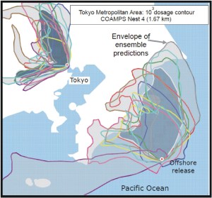 A few years ago we published a paper showing high-resolution (~1 km) simulations of tracer releases in various coastal areas of Japan.** We demonstrated an “ensemble” framework that allowed a more accurate estimation of plume shapes and exposed population. Our technique involved varying key ocean and atmosphere parameters used by a meteorological model (e.g., sea surface temperatures, urban sources of heat, building heights) to better capture the variability and produce more realistic wind forecasts. Our results showed that coastal releases are subject to fluctuating conditions so that even though the average direction of winds is off-shore at most locations along the east coast of Japan, events like weather fronts and sea breezes can still drive the plumes toward large inland cities.