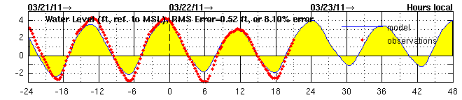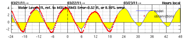 Modeled (past and predicted) and observed Hudson currents (arrows show direction) and water levels (relative to mean sea level, MSL) at the center of the Hudson west of 79th St boat basin, with hour from midnight on 3/22/11 on the x-axis. Figures are from NYHOPS, http://stevens.edu/maritimeforecast.