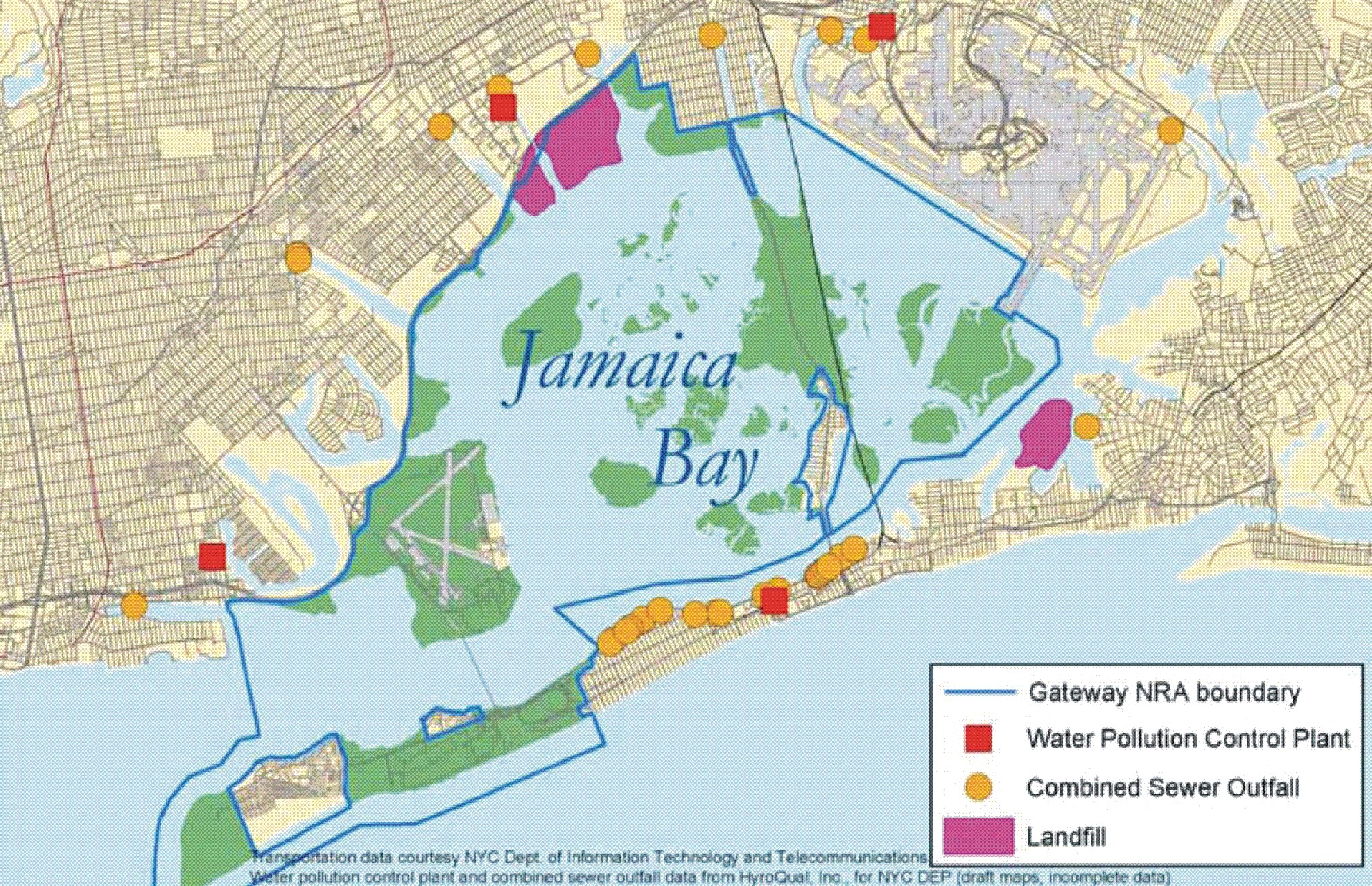 Another problem with Jamaica Bay and surrounding communities is that raw sewage spills occur several dozen times per year when it rains over the bay’s watershed. These occur when rainfall rates are fast enough to overflow the sewage treatment plant reservoirs, and force “combined sewage overflows” – releases of the mixed rainwater and sewage to Jamaica Bay through sewer pipes.