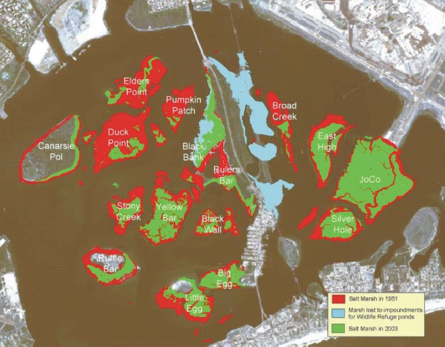 Red and blue regions mark salt marsh losses since 1951, and green areas show marsh area in 2003. Source: http://nbii-nin.ciesin.columbia.edu/jamaicabay/jbwppac/JBAC_NPS_SaltMarshReport_080207.pdf.