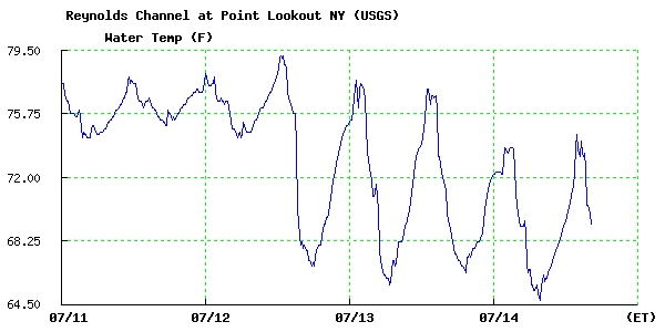 Here, it shows how temperatures took a dive the middle of this week … in terms of the twice-daily cycles you see, at this time of year, the minima reflect the cool ocean water coming into the inlet, while the maxima reflect the warm inland waters when the tides run out to sea.