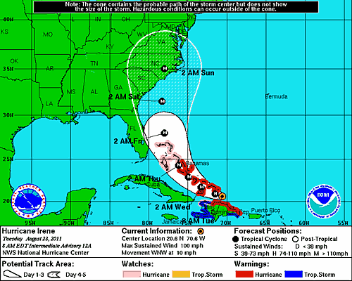 The likelihood of Irene striking the Southeastern U.S. Coast is moderately high, but the NHC’s forecast discussion makes clear that “IT IS IMPORTANT TO REMIND USERS NOT TO FOCUS ON THE EXACT FORECAST TRACK…ESPECIALLY AT DAYS 4 AND 5 (or beyond) … SINCE THE MOST RECENT 5-YEAR AVERAGE ERRORS AT THOSE FORECAST TIMES ARE 200 AND 250 MILES… RESPECTIVELY.”