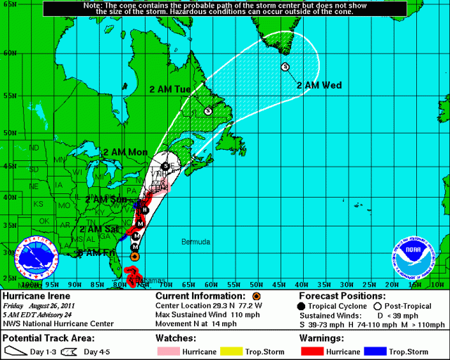 This morning, the Hurricane Irene forecast from the National Hurricane Center has held fairly steady, with little good news for New York and New Jersey interests. Irene is currently forecast (as of 5 am) to pass just to the east of NYC as a strong Category 1 Hurricane on Sunday August 28th. As before, the forecast at two and a half days lead time is still highly uncertain — one model still predicts it going over Washington D.C. and northward, and two models (of eight) predict it going far offshore, well to the east of Long Island. But the worst case scenario was spelled out in a recent post, comparing the storm to a hurricane that hit NYC in 1821.