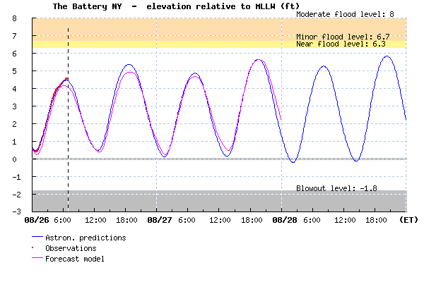 Predicted Tide (blue), observations (red dots) and SSWS water elevation forecast (magenta) at The Battery, New York City, for Saturday and Sunday August 26-28. High tides along Long Island are at a similar time, and along the Jersey Shore are about one hour earlier.