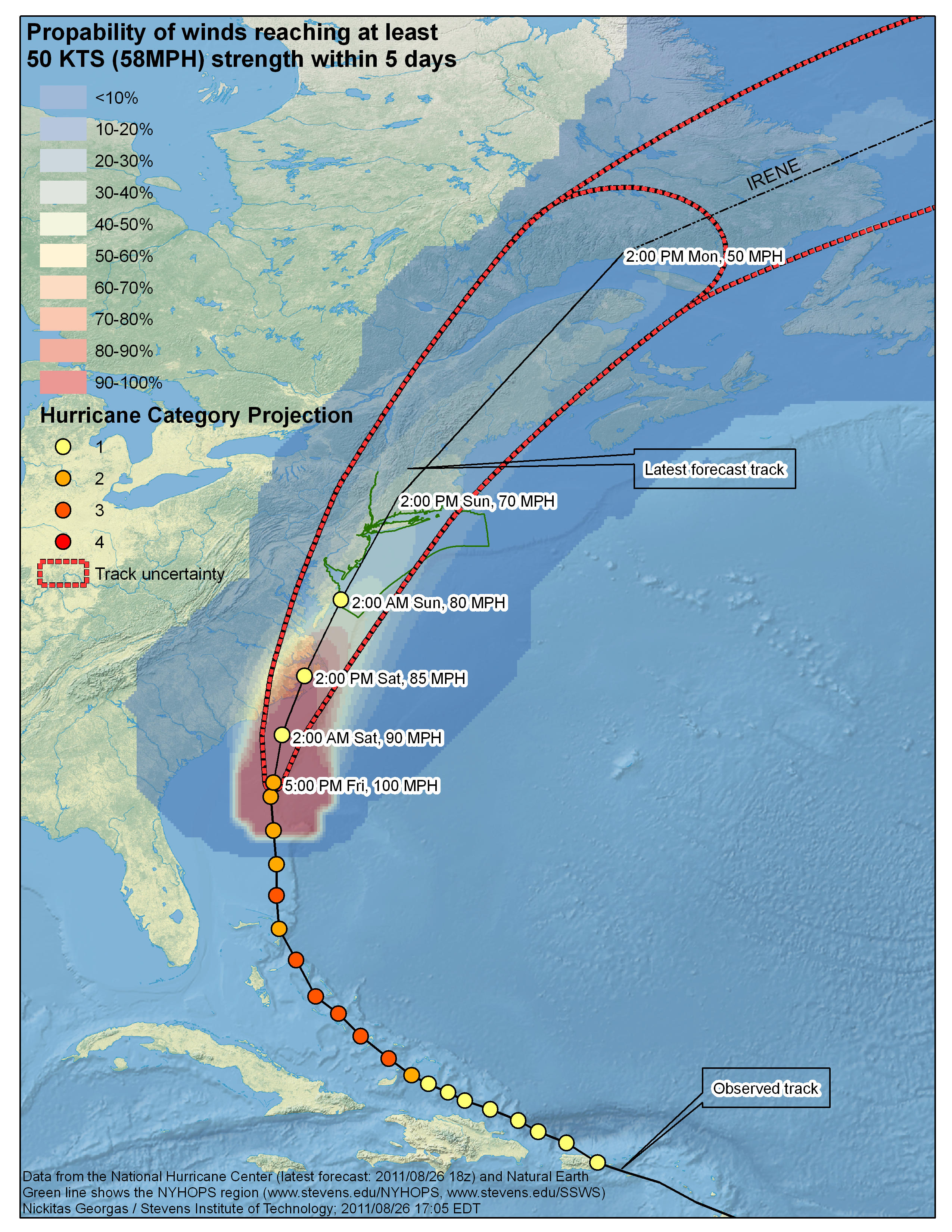 NOAA’s storm surge model (P-SURGE) is providing useful information in their 3 day forecast for our area, listing the probability of a 4 foot or greater storm surge at only about 20%. Depending on the timing with high or low tide, this water level could lead to overtopping of seawalls around the New York City inland waterways, and flooding of low-lying infrastructure (subways, PATH train, tunnels, FDR highway, etc.). They list the probability of a devastating 8+ foot surge at 5-10%. Stevens Institute’s two-day advance forecasts of storm surge, as well as waves and currents for NYC, NJ, Long Island waterways, are posted at about 1:30 AM daily, so look for them Saturday morning to give highly detailed forecasts for Irene’s Sunday impacts.