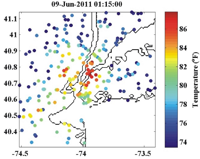Air temperature measurements at 1:15 AM during a recent heat wave. The 240 weather stations demonstrate how some neighborhoods around New York City were as much as 15 degrees warmer than rural areas. Data credits given below. Also see a similar map for January.