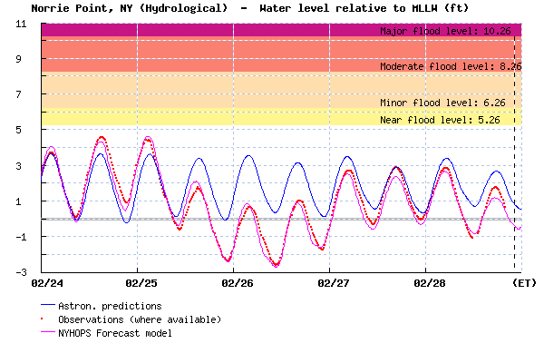 Time history of water elevation in feet: tide predictions (blue), NYHOPS model predictions (magenta) and observations (red dots) at Norrie Point along the Hudson (near Poughkeepsie). Zero elevation is mean-lower-low-water (MLLW), the typical daily low tide level. Not doing bad, NYHOPS!