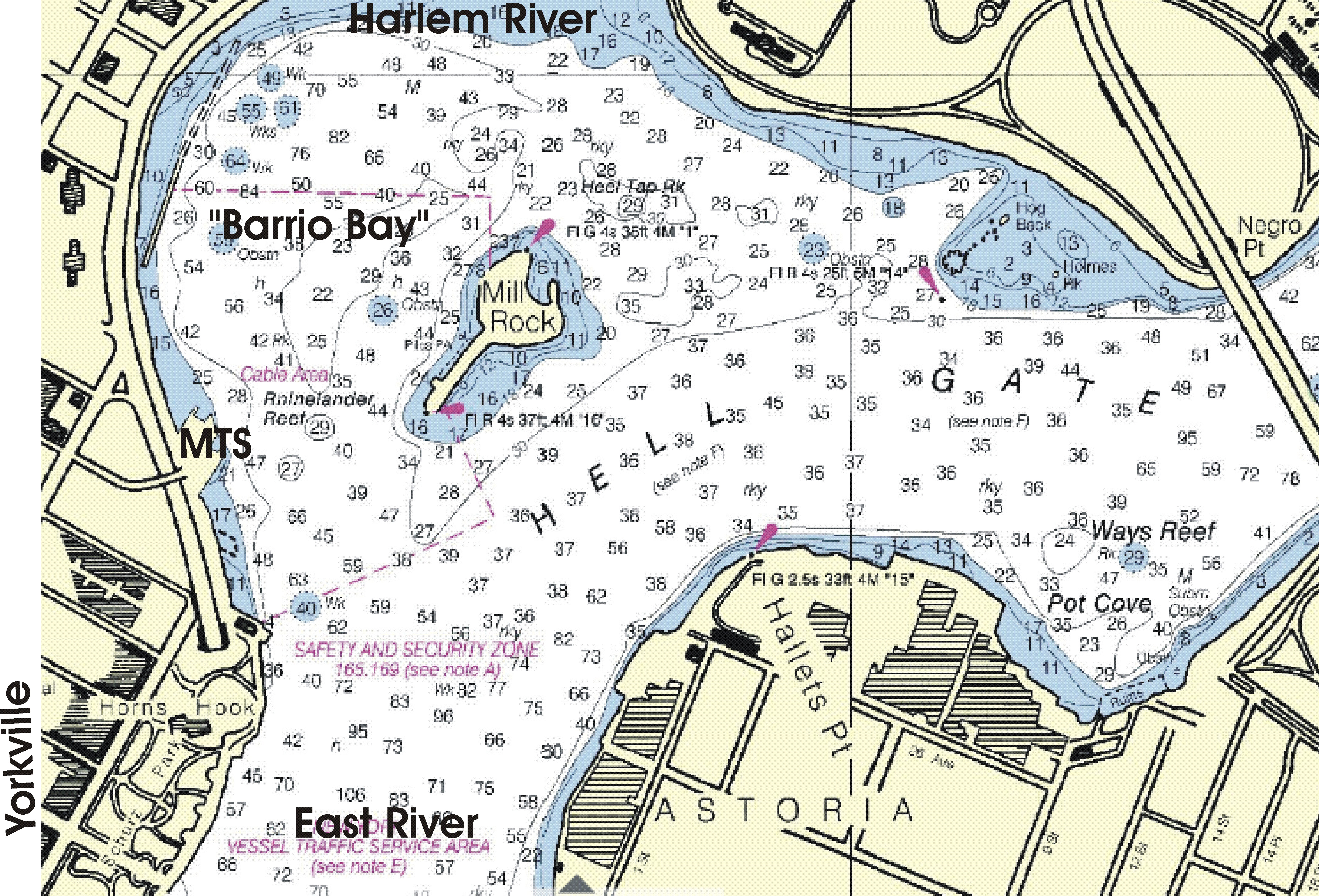 This site isn’t really in what’s typically perceived by mariners to be Hell Gate (see below), so much as it is in a calm-water embayment off to the side (it should be given a name — how about “Barrio Bay”). Ship traffic mostly follows East River out to Long Island Sound, so doesn’t go behind the small island (Mill Rock) into this embayment, so there is no obvious reason why the new expanded MTS would cause navigational danger or problems of any sort. Historically, at least prior to about ~1915, there actually were many piers in Barrio Bay, and these were eventually filled in and covered by the highway (check out the “greatest grid” exhibit at the Museum of City of New York).