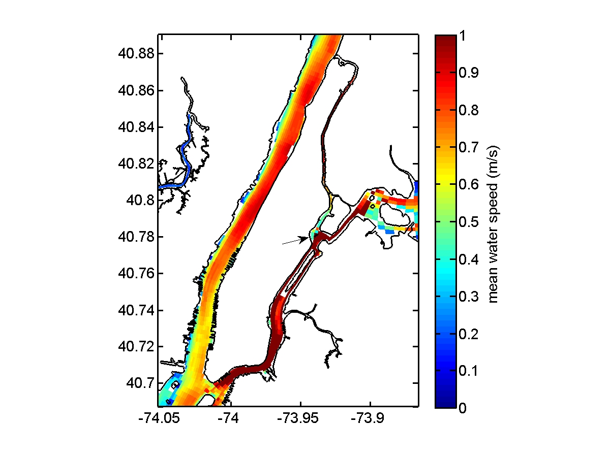 Vladimir – do you think our model overestimates the average current speed there? We don’t have great spatial resolution for the model at that site and in Harlem River, so it may not be as accurate as we’d like. My sense from walking and biking past there many times is that the average current speed is probably even weaker than 1 mph.