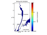 Maximum sewage pathogen concentrations in surface waters from Wednesday through Saturday, relative to a value of 1.0 in the region offshore of Tarrytown, NY. A full movie of the 4-day simulation is linked from the next figure, below. The maximum is taken over time, separately at each location.