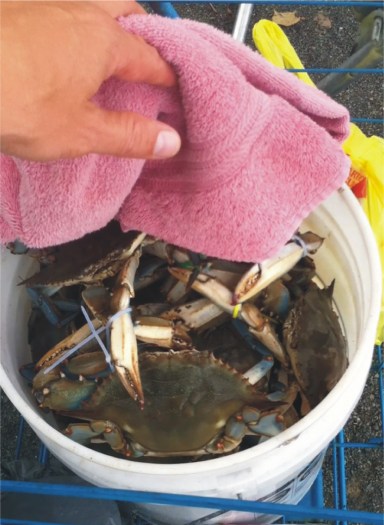 A full bucket of blue crabs caught by an urban fisherman on a Hoboken pier at the edge of the Hudson River, September 27, 2012. He used six 10″ traps and spent five hours fishing.