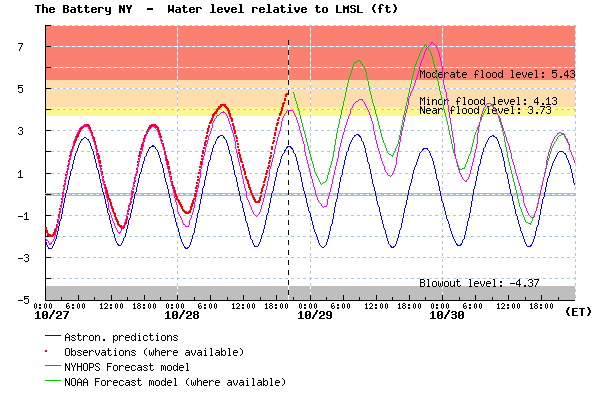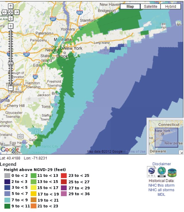 Above is a figure showing the NYHOPS and NOAA forecasts for Battery Park — the New York/ New Jersey Harbor region – 7.1 ft above mean sea level. This is about 1-2 ft above some low seawalls around the city; a few inches higher than Irene’s flood level. The surge doesn’t coincide with the high tide in this forecast, but if the storm comes a few hours earlier, then the total water level will be a few feet higher.