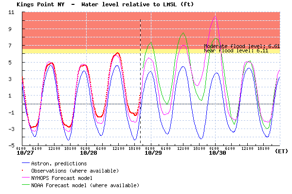 Above is the forecast for Kings Point and other areas in Western Long Island Sound and the eastern end of East River (e.g. Flushing) – 10.4 ft above local mean sea level; this is roughly 2.5 ft ABOVE Irene’s flood elevations.