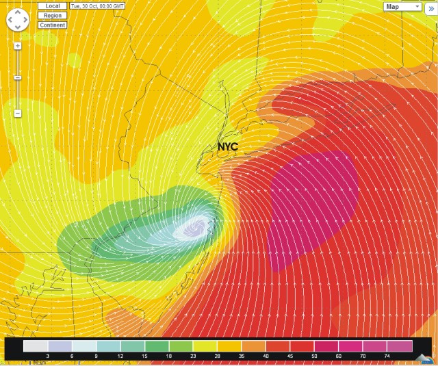Wind forecast (scale in knots) for 7pm Monday, from NOAA’s North American Mesoscale (NAM) model, showing winds blowing into NY Harbor at 45-55mph (red color) and even 55-65mph (magenta). The eye of the storm is the region with weak winds (white). (created with the Weather Underground map tool).