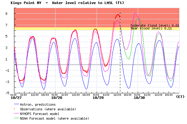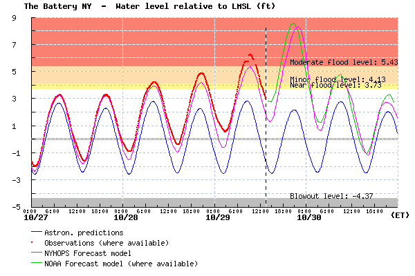 These figures nicely illustrate the time-dependence of the problem — when the high tide and peak water levels hit, as well as how the tides are crucial to the floods — at Battery, the current timing of the peak surge (and basically, storm landfall of NJ) is at high tide. At Kings Point, the forecast is for the peak surge to come before high tide, so water levels are not as likely to break records.