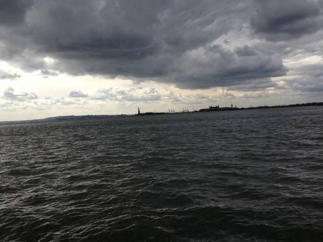 NY harbor, normally bustling with vessel traffic, is quiet Friday afternoon. In the distance, vessels are moored awaiting entrance to the harbor.