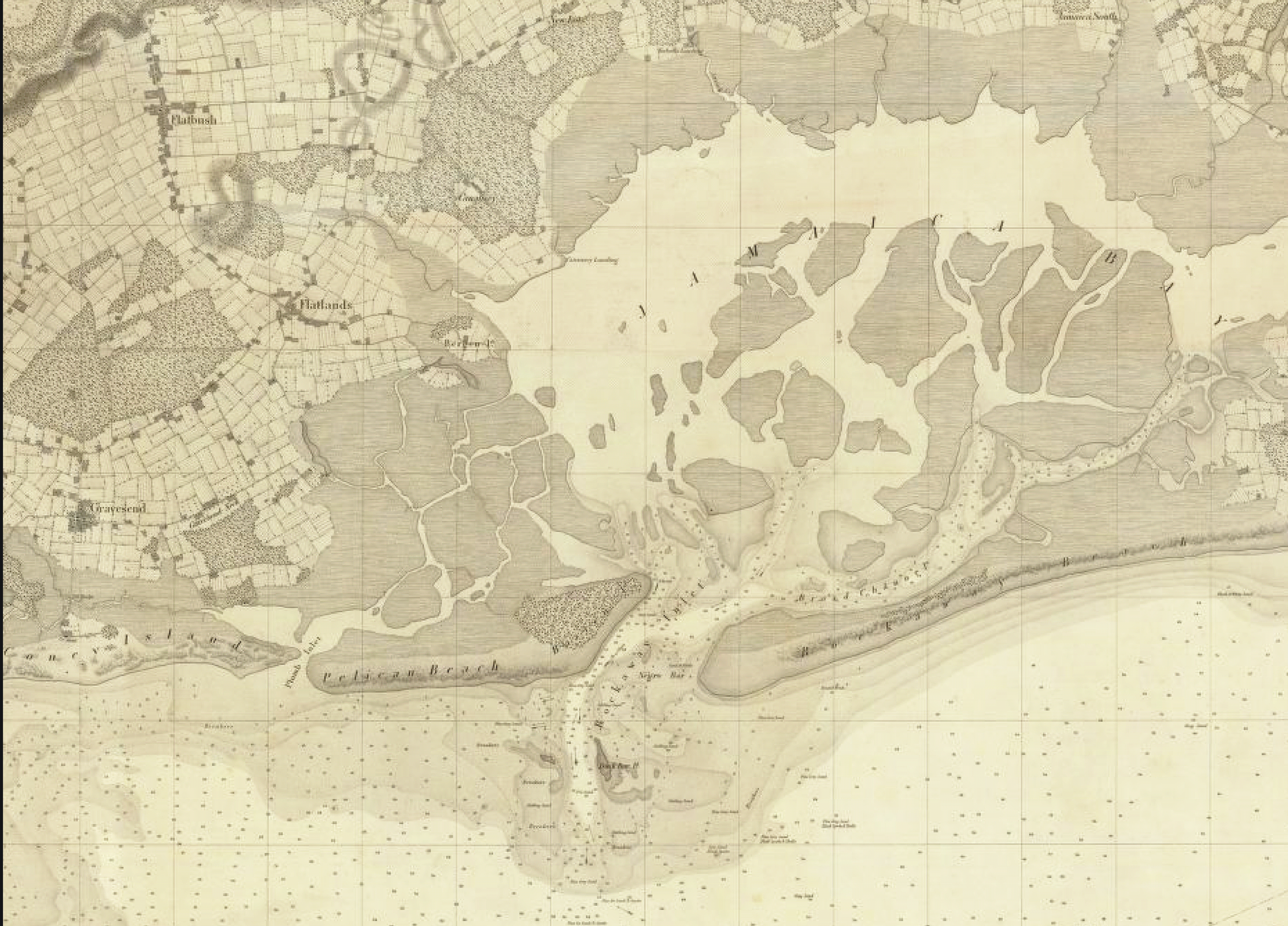 Jamaica Bay in 1844 – note the different location of the bay’s entrance channel (Coney Island is to the far left). Small specks are actually depth values – this was a large map and these are readable in the full-size version. There are no depths across the bulk of Jamaica Bay because it was too shallow at that time for anything but small boats.