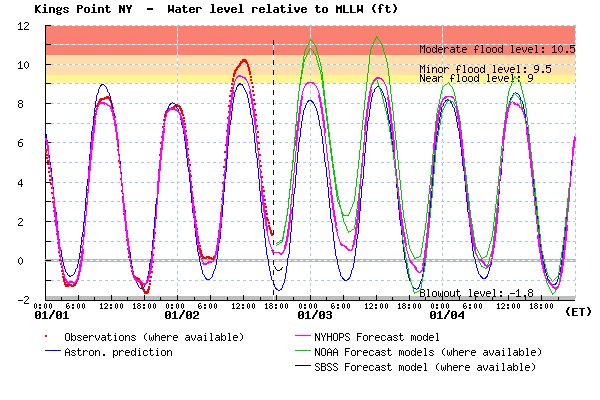 Stevens NYHOPS Storm Surge Warning System forecast for water levels at Kings Point (magenta), relative to mean lower low water (MLLW – normal daily low tide). Predicted tides are also shown (blue), as well as observed water levels (red) and two NOAA ET-Surge forecasts for comparison (green).