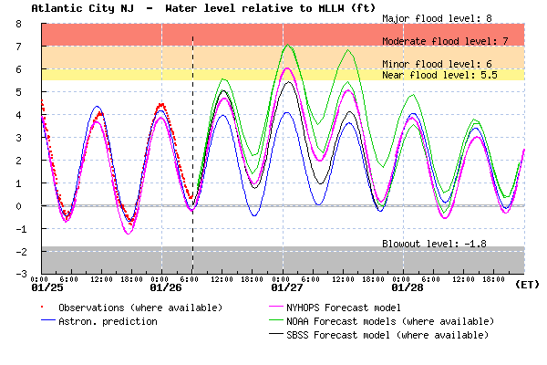 Coastal flood forecast for New York Harbor in feet above mean lower low water (average daily low tide). In addition to the astronomical tide prediction, four forecasts are shown. The Stevens forecast is the magenta line. Large waves and erosion could also be a factor on the Jersey Shore.