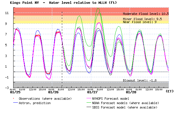 Coastal flood forecast for western Long Island Sound (Kings Point) in feet above mean lower low water (average daily low tide). In addition to the astronomical tide prediction (blue), four forecasts are shown. NOAA forecasts are in green. The Stevens forecast is the magenta line.