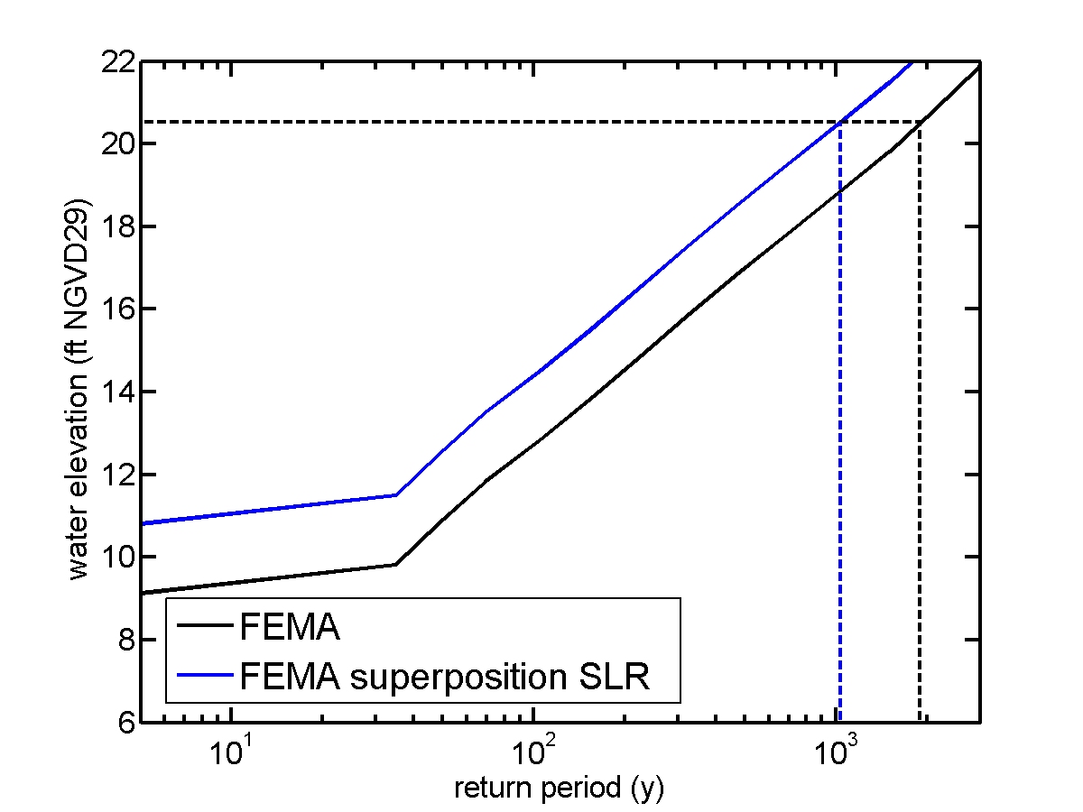 Flood exceedance curves, showing return period (10, 100, 1000 years) versus still-water elevation. (black solid line) FEMA’s flood return period curve for Midland Beach, Staten Island, offset by +0.6 feet to match the Corps’ numbers. (blue solid line) the same curve, offset by 20 inches of sea level rise, showing a reduction in return period for the 20.5 foot flood from ~2000 years (dashed lines) to ~1000 years.