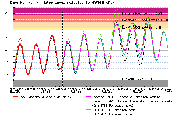 The southern half of the New Jersey Coast (Atlantic City to Cape May) is likely to have moderate flooding, and while it is unlikely (0-20% chance), it is possible that there will be major flooding. Expected peak flood levels are about 4-6 feet navd88, which would be similar to the 5-foot flood height that occurred early last October (see figure below).