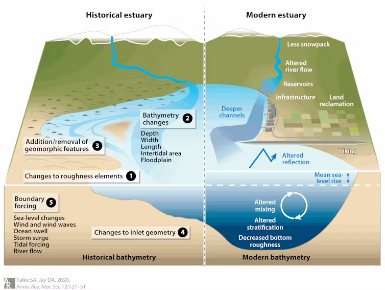 Our research reveals an opportunity for scientists, engineers and broader society to think bigger – to consider a more comprehensive reshaping and restoration of the natural features of estuaries that once mitigated or absorbed flooding.